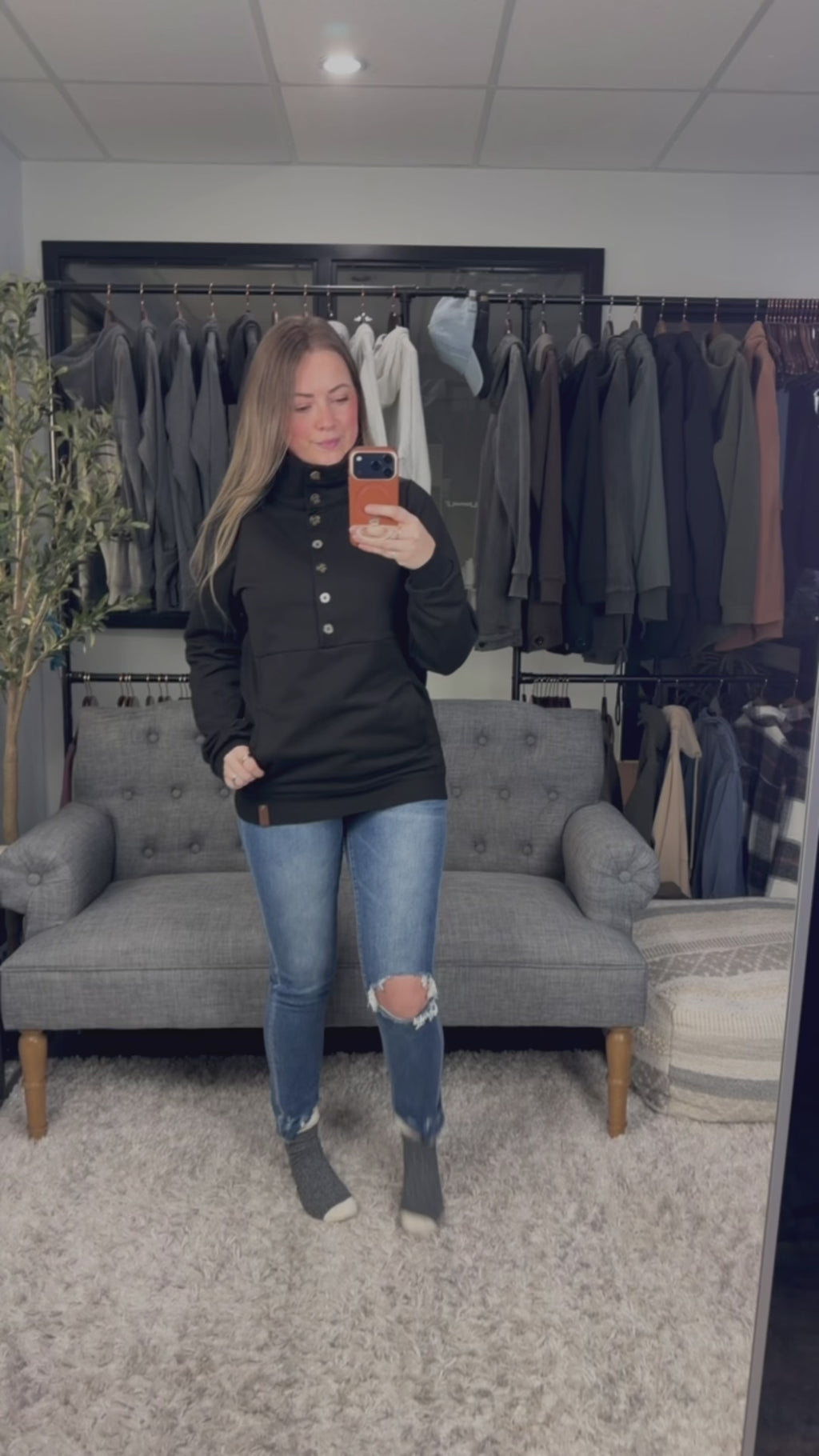 The Button Harlow features tortoiseshell buttons, welt pockets and tall cowl-pop neckline for a polished yet cozy look. Designed with a longer tunic length, it can be worn long for extra coverage or styled higher to suit your preference.