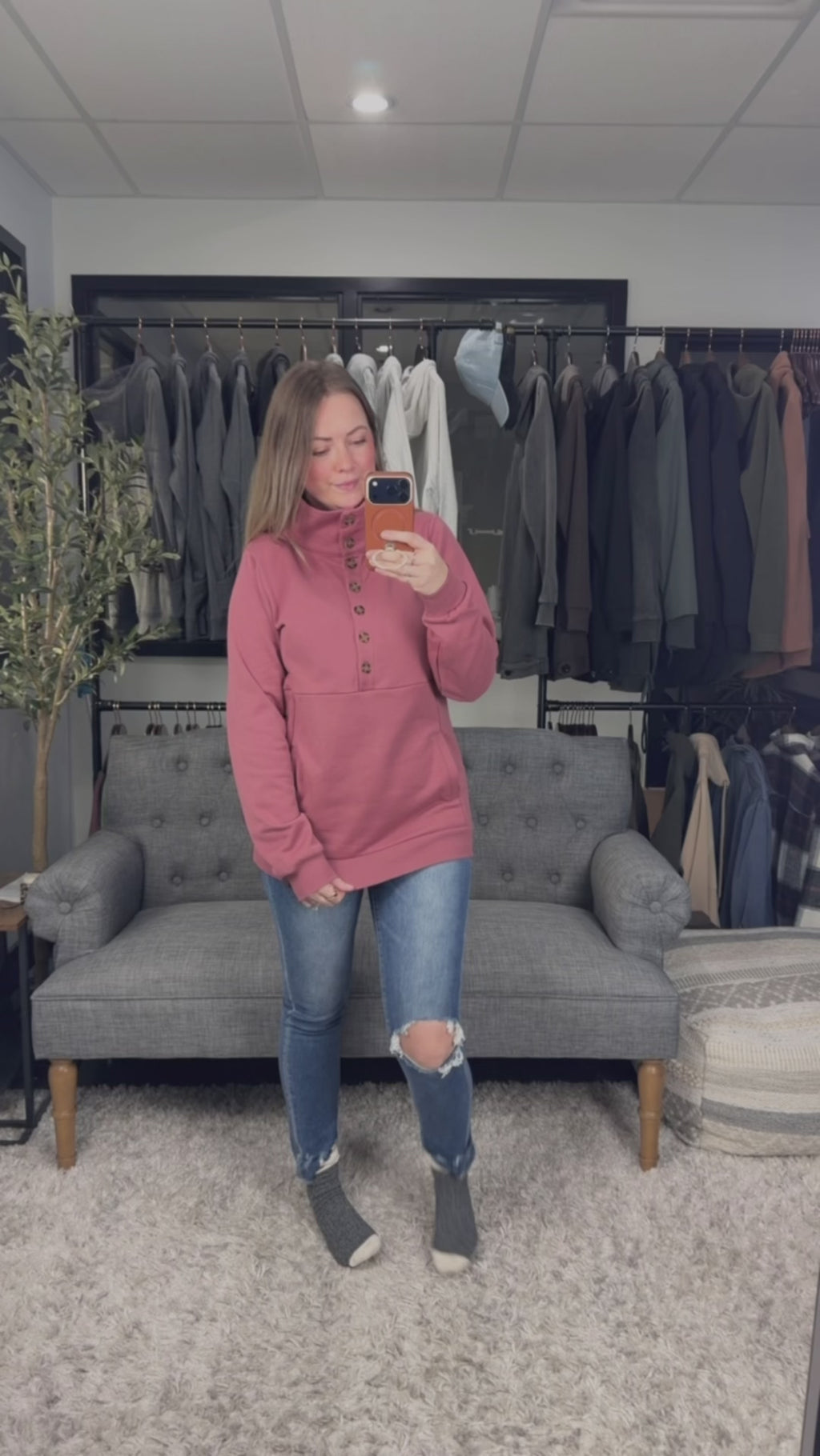 The Button Harlow features tortoiseshell buttons, welt pockets and tall cowl-pop neckline for a polished yet cozy look. Designed with a longer tunic length, it can be worn long for extra coverage or styled higher to suit your preference.