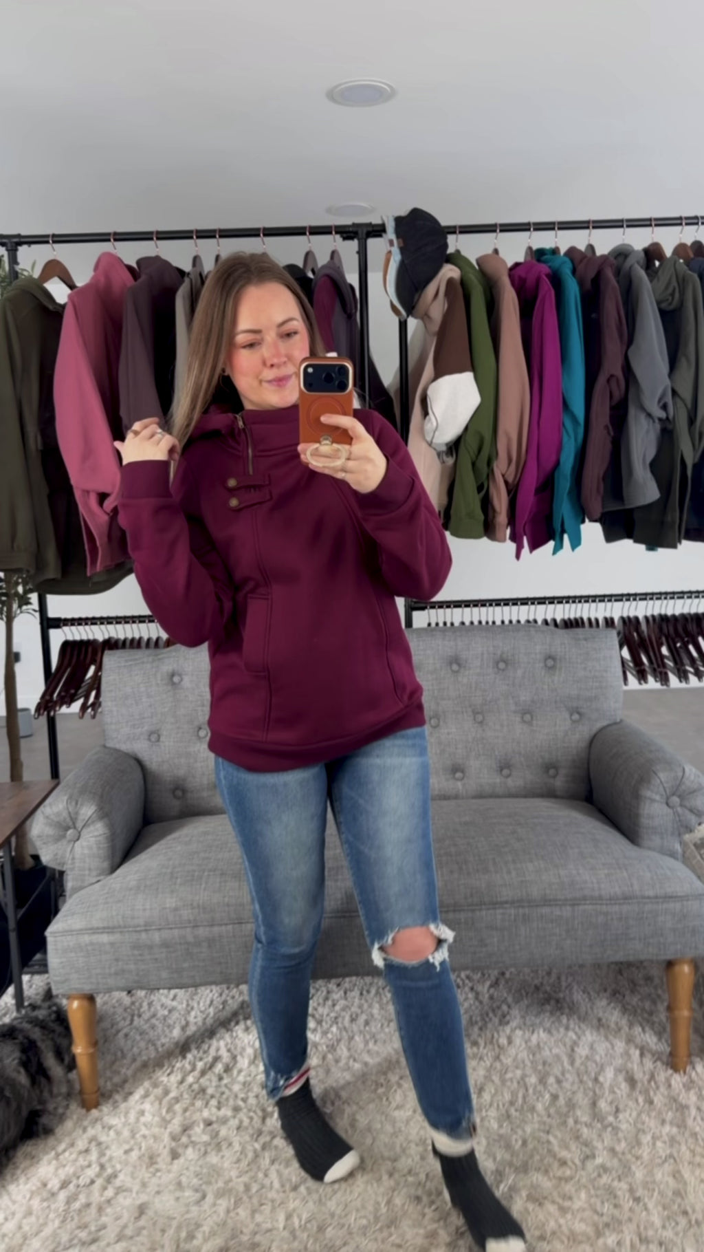 The Remi Hoodie features an off-center zipper at the neckline, branded snap flap details and a cute little pocket detail on the arm. The fabric is smooth on the outside with a soft brushed, cozy inside that is warm without being bulky.